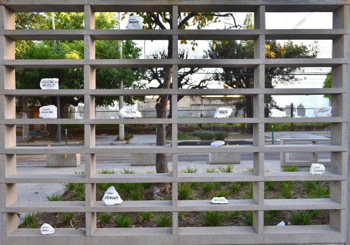 Sin duda, quien realizó la intervención, conoce la obra y trayectoria de Jorge Méndez Blake. Lo que hizo el autor anónimo de arte callejero, fue colocar rocas, pintadas de blanco con el nombre de autores de la literatura universal. Cada piedra tiene una pequeña base de plástico para no dañar la escultura de concreto. Esto demuestra que el autor anónimo conoce y aprecia el arte.