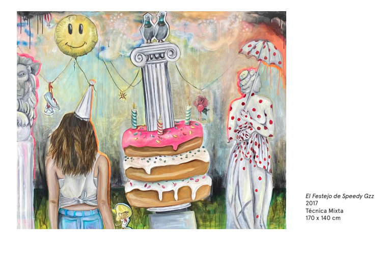 Tengo mucha obra comisionada últimamente, entonces ven algo y quieren algo parecido. Me puse a hacer también obras más personales, pintar lo que viene a mi mente y no piezas comisionadas. Me gustan las combinaciones de cosas ilógicas, jugar con la perspectiva, o algo muy real. Me gusta explorar de todo, si me gustaría trabajar lo abstracto como reto, porque siempre necesito algo en donde anclarme, como que lo figurativo es más tangible y el abstracto es un desorden que tu tienes que ordenar en tu cabeza.