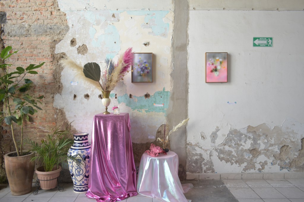 Paulina Barragán crea estas instalaciones de naturaleza muerta que queda congelada en el tiempo creando un diálogo con las pinturas de Alejandra Gómez quien por muchos años se dedicó a la floristería.